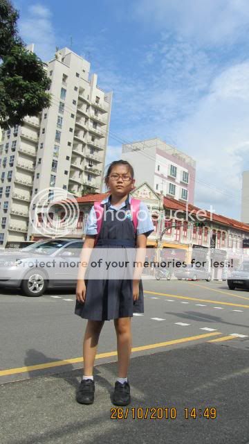 Tôi đi ra ngoài phố mua ít đồ dùng, gặp em bé này vừa đi học về, thế là chụp cho em bé tấm hình, và nhờ em bé chụp lại cho một tấm. Em bé nói tiếng Hoa và tiếng Anh.